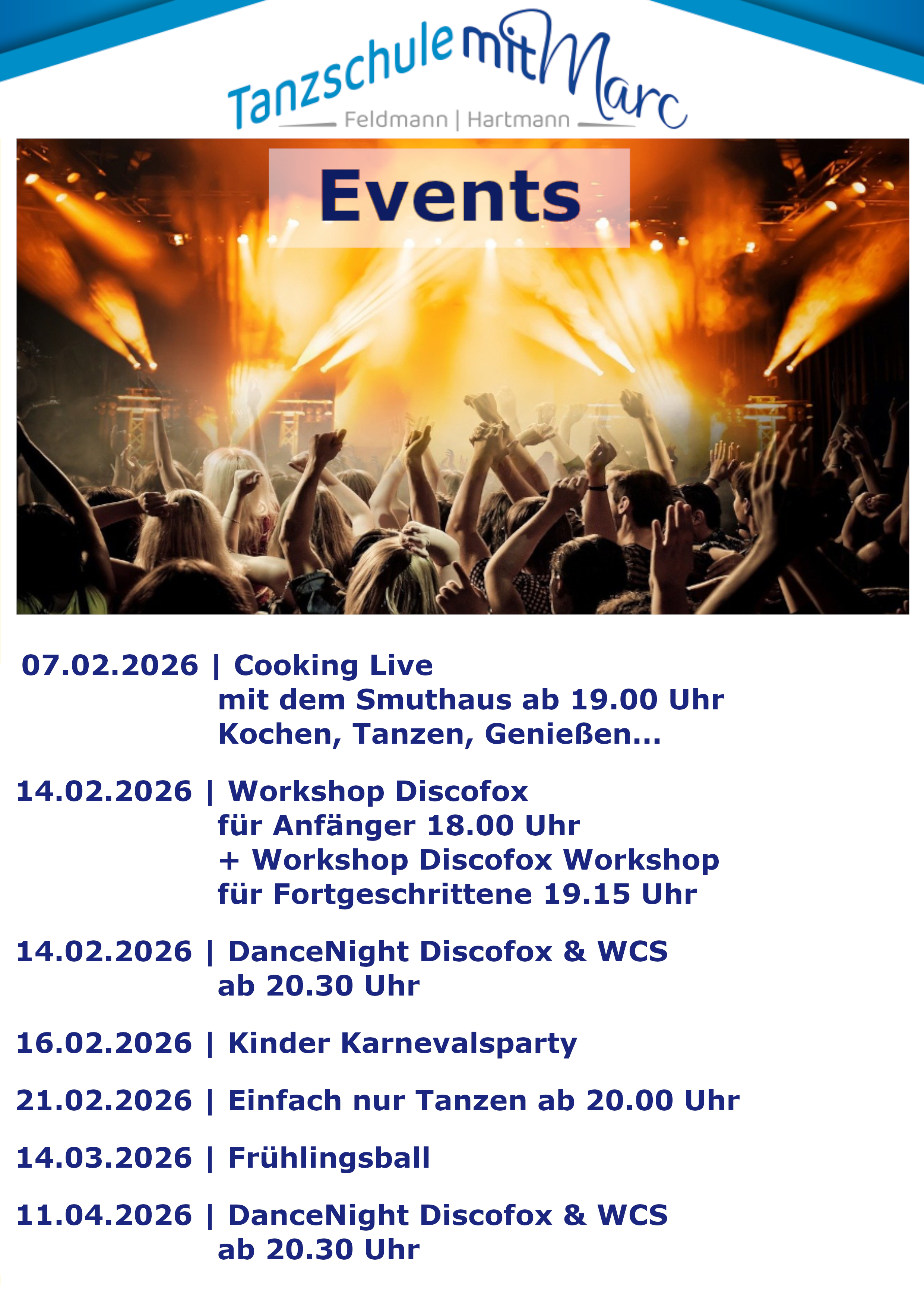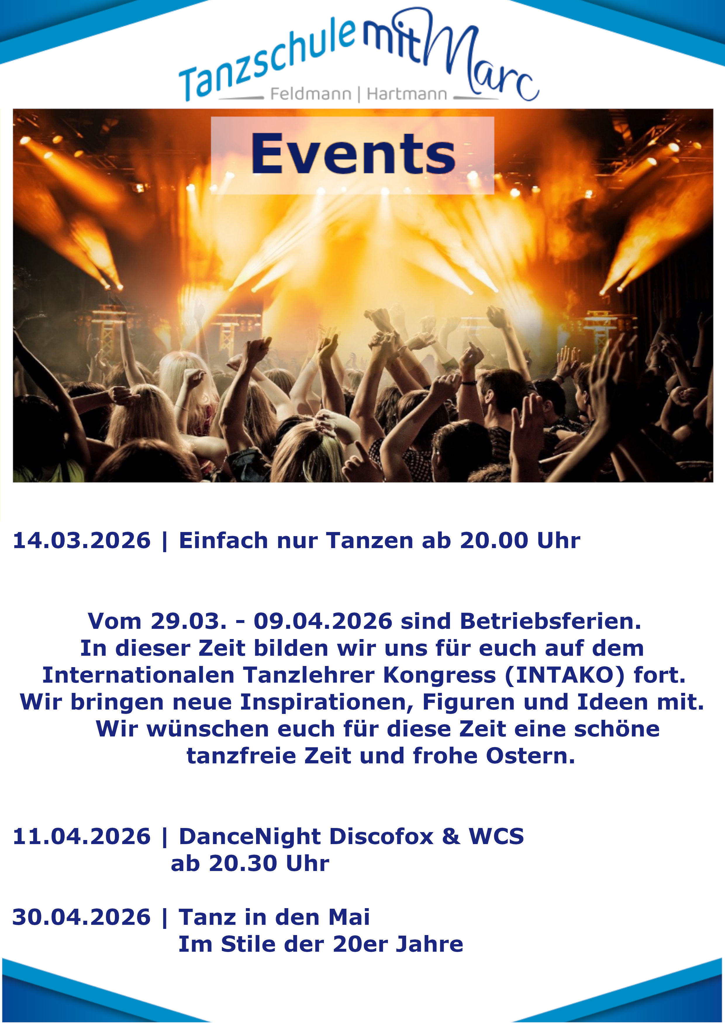 neue Einsteiger-Kurse beginnen jeden Monat für Paare (incl-. 3 neuer Hochzeitskurse), Schüler und Disco-Fox. Ihr findet die Kurse unter den jeweiligen Navigationspunkten.